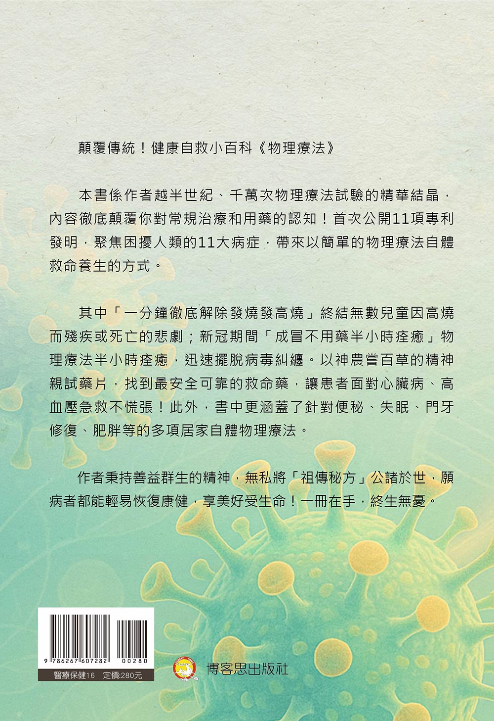本書作者超越半世紀、千萬次物理療法試驗的精華結晶,內容徹底顛覆一般人對常規治療和用藥的認知!首次公開11項專利發明,聚焦困擾人類的11大病症,帶來以簡單的物理療法自體救命養生的觀點。