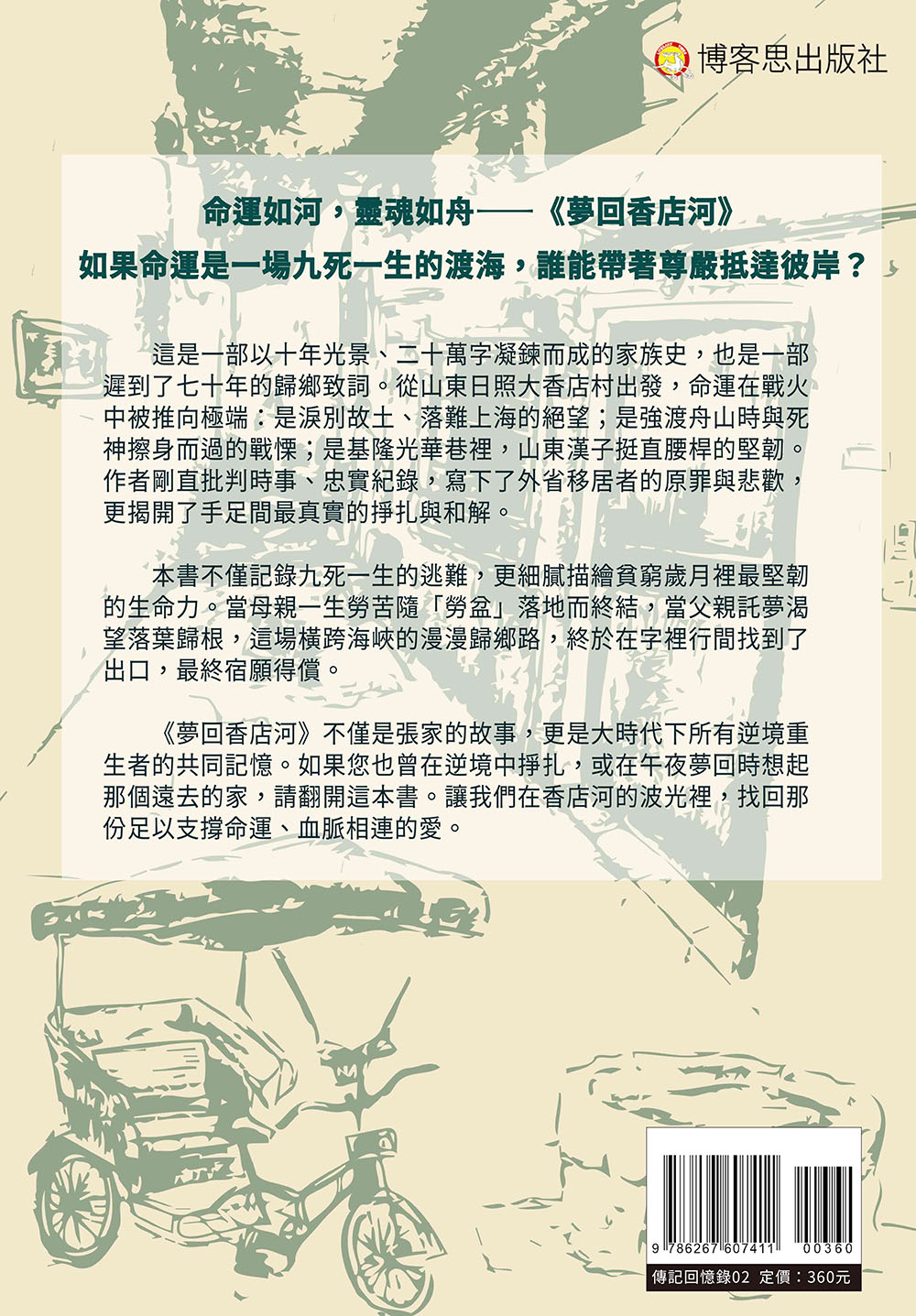 《夢回香店河》不僅是張家的故事,更是大時代下所有逆境重生者的共同記憶。如果您也曾在逆境中掙扎,或在午夜夢回時想起那個遠去的家,請翻開這本書。讓我們在香店河的波光裡,找回那份足以支撐命運、血脈相連的愛。#博客思出版社