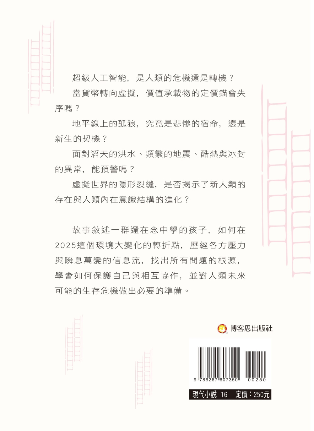 故事敘述一群還在念中學的孩子﹐如何在2025這個環境大變化的轉折點﹐歷經各方壓力與瞬息萬變的信息流﹐找出所有問題的根源﹐學會如何保護自己與相互協作﹐並對人類未來可能的生存危機做出必要的準備。 #台灣博客思出版社